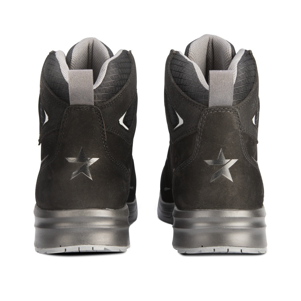 The Talus GTX Mid is a discreet mid-cut boot that nevertheless packs a host of high-performance features. A sporty feel is provided by a highly cushioning, molded PU midsole, along with excellent grip thanks to the pattern and compound on the rubber outsole. The upper is made of durable LWG leather combined with lightweight microfiber. The GORE-TEX® membrane ensures high breathability and prevents water from penetrating the shoe. The speed lacing allows for quick entry and exit. Those who prefer traditional lacing and even more discretion can swap the speed lacing for the complementary black laces. A fiberglass toe cap and soft nail protection feature. ESD function according to EN IEC 61340-4-3:2018.