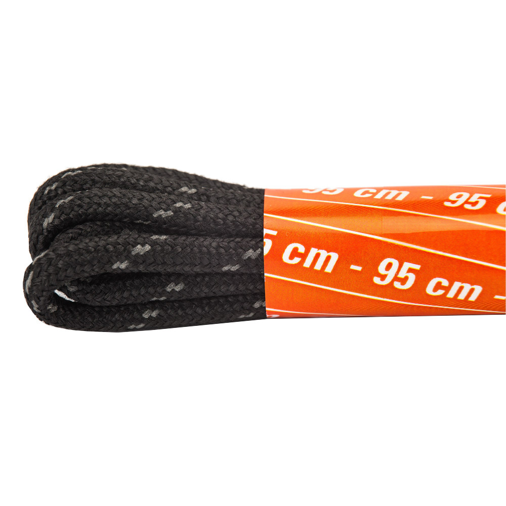 Black/grey round laces made of used PET bottles, which are recycled after use. A solid core provides the right density and elasticity. This shoelace construction keeps the shoes on tight, thus ensuring stability. Size: 95 cm.