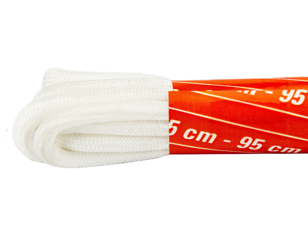 Weiße, runde Schnürsenkel aus gebrauchten PET-Flaschen, die nach Gebrauch recycelt werden. Ein fester Kern sorgt für die richtige Dichte und Elastizität. Aufgrund der besonderen Ausführung der Schnürsenkel werden die Schuhe eng anliegend gehalten und sorgen so für Stabilität. Größe: 95 cm.
